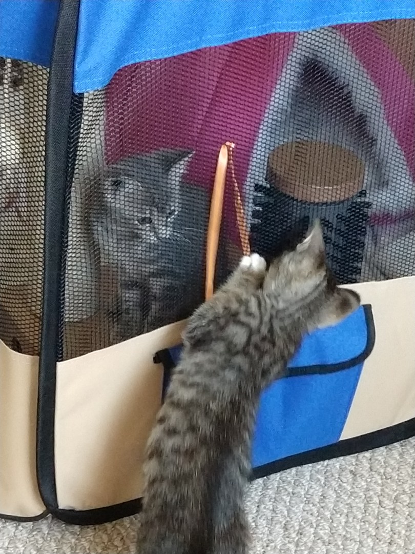 One of the claws-and-escape bath babies. 4. After a two week quarantine and any diseases are fully treated, kittens move into the social pen. Because kittens can’t be tested for FIV (Feline Immunodeficiency Virus) and FeLV (Feline Leukemia Virus) until they’re two pounds, we keep them separate from Squeaker via this mesh pen. The pen is also a good way for shy kittens or kittens with no human experience to get used to being around people. It’s also a good way for them to get to know Squeaker- they can play with each other through the pen walls without risking a bite or lick that would transmit something dangerous.